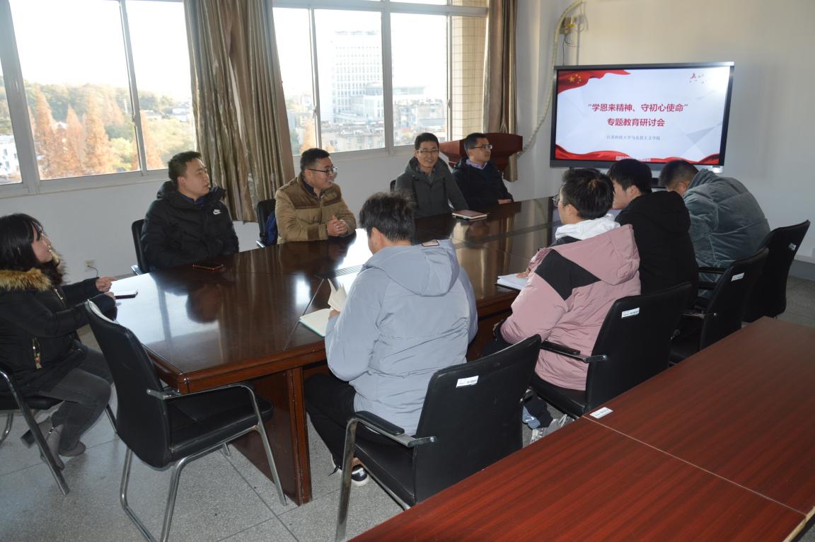 根据公司纪委“学恩来精神、守初心使命”专题教育活动工作部署,12月15日太阳成tyc122cc在实验综合楼805召开“学恩来精神、守初心使命”专题教育研讨会。研思政教研室周远全老师,马克思主义基本原理教研室李西杰老师,研究生教研室杨虎老师,毛中特教研室赵勇老师,郭红燕老师和科学技术史全体研究生参加会议。