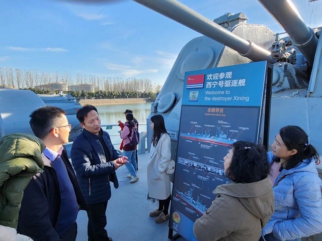 下午,教师们来到位于泰州大桥下的海军舰艇文化园,参观了“西宁”号导弹驱逐舰、“厦门”号导弹护卫舰、“洪泽湖”号综合补给舰和274号潜艇。虽然上述“三舰一艇”都是退役舰艇,但大家还是能实地体验到水兵们的工作、训练和生活,感受到人民海军在奋斗实践中形成的光荣传统和优良作风。参观间隙,部分老师还录制了相关微课和教学素材。