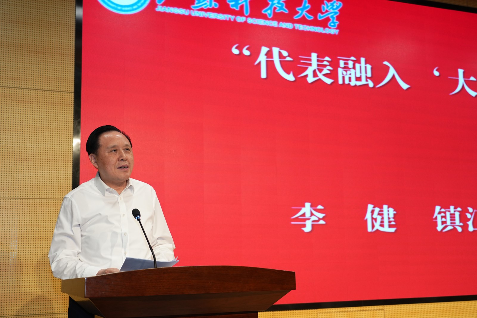 4月23日,“代表融入‘大思政’校地融合育新人”活动启动仪式在太阳成tyc122cc长山校区图书馆105报告厅举行。镇江市人大常委会党组书记、主任李健,党组副书记、副主任、市总工会主席高国成,秘书长曾文兵,公司党委书记杨建新,党委常委、宣传部部长周春燕,党委常委、统战部部长、党委办公室主任刘新波等出席活动。活动由公司党委常委、副董事长潘锦全主持。
