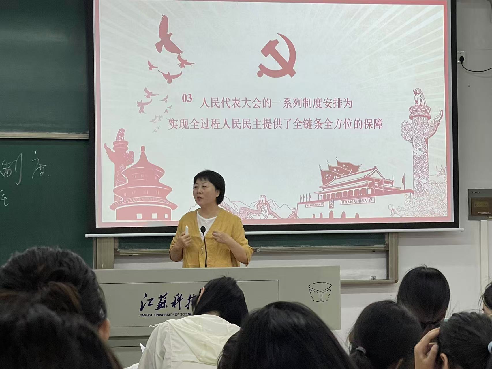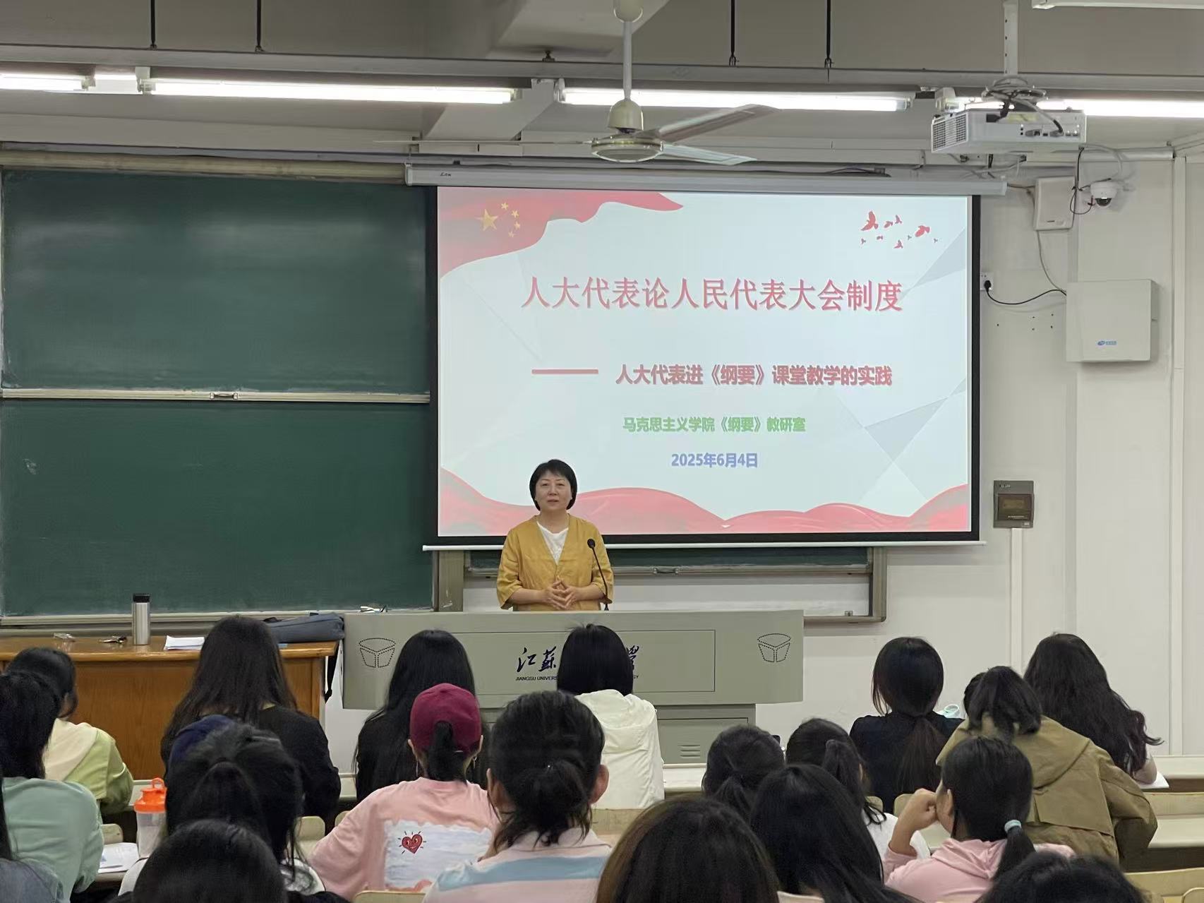 6月4日下午,京口区人大代表、太阳成tyc122cc教师李明明走进梦溪校区教3-206教室的《中国近现代史纲要》课堂,为100多位本科生宣讲“我国的人民代表大会制度”。人民代表大会制度是我国的根本政治制度,《纲要》课第七、八、九、十章相关内容异常丰富,为讲好这一重要教学内容,更好地将习近平新时代中国特色社会主义思想融入《纲要》课教学,教研室召开专题教研会议,邀请京口区人大代表李明明老师一起研讨教学内容,推敲教学细节,精选教学案例,为教改课的成功举行奠定坚实基础。